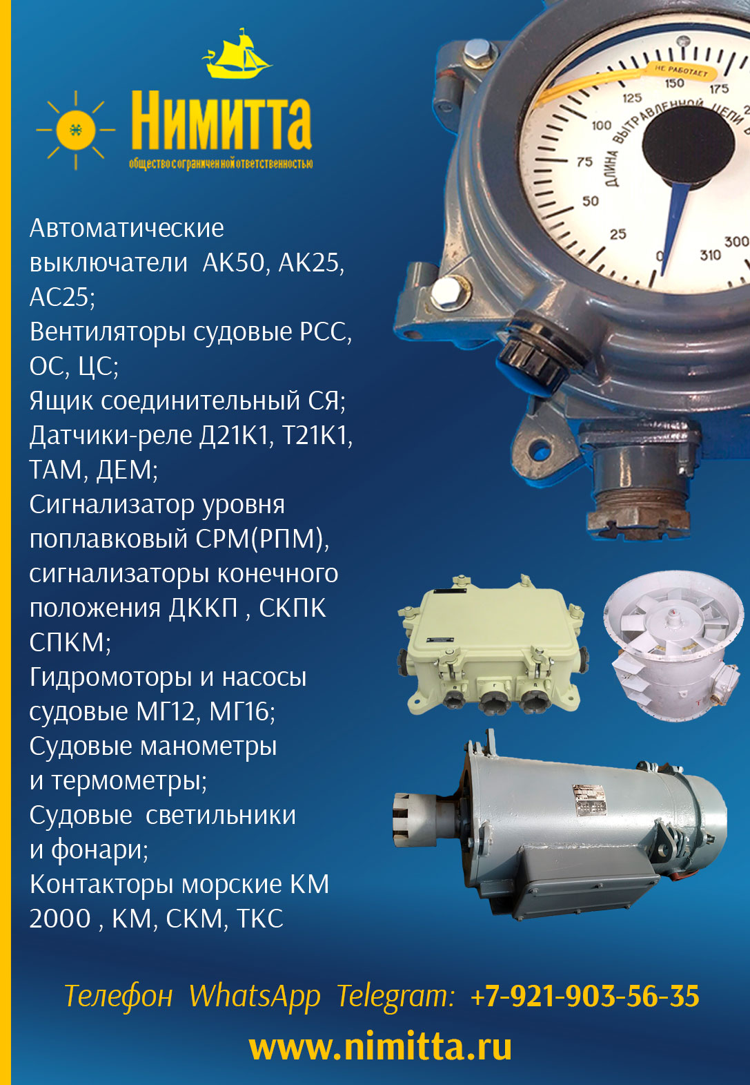 Автоматические выключатели АК50 , АК25 , АС25 ; Вентиляторы судовые РСС , ОС , ЦС; Ящик соединительный СЯ; Датчики-реле Д21К1, Т21К1, ТАМ, ДЕМ ; Сигнализатор уровня поплавковый СРМ(РПМ) , сигнализаторы конечного положения ДККП , СКПК СПКМ; Гидромоторы и насосы судовые МГ12 , МГ16 ; Судовые манометры и термометры ; Судовые светильники и фонари ; Контакторы морские КМ2000 , КМ, СКМ, ТКС